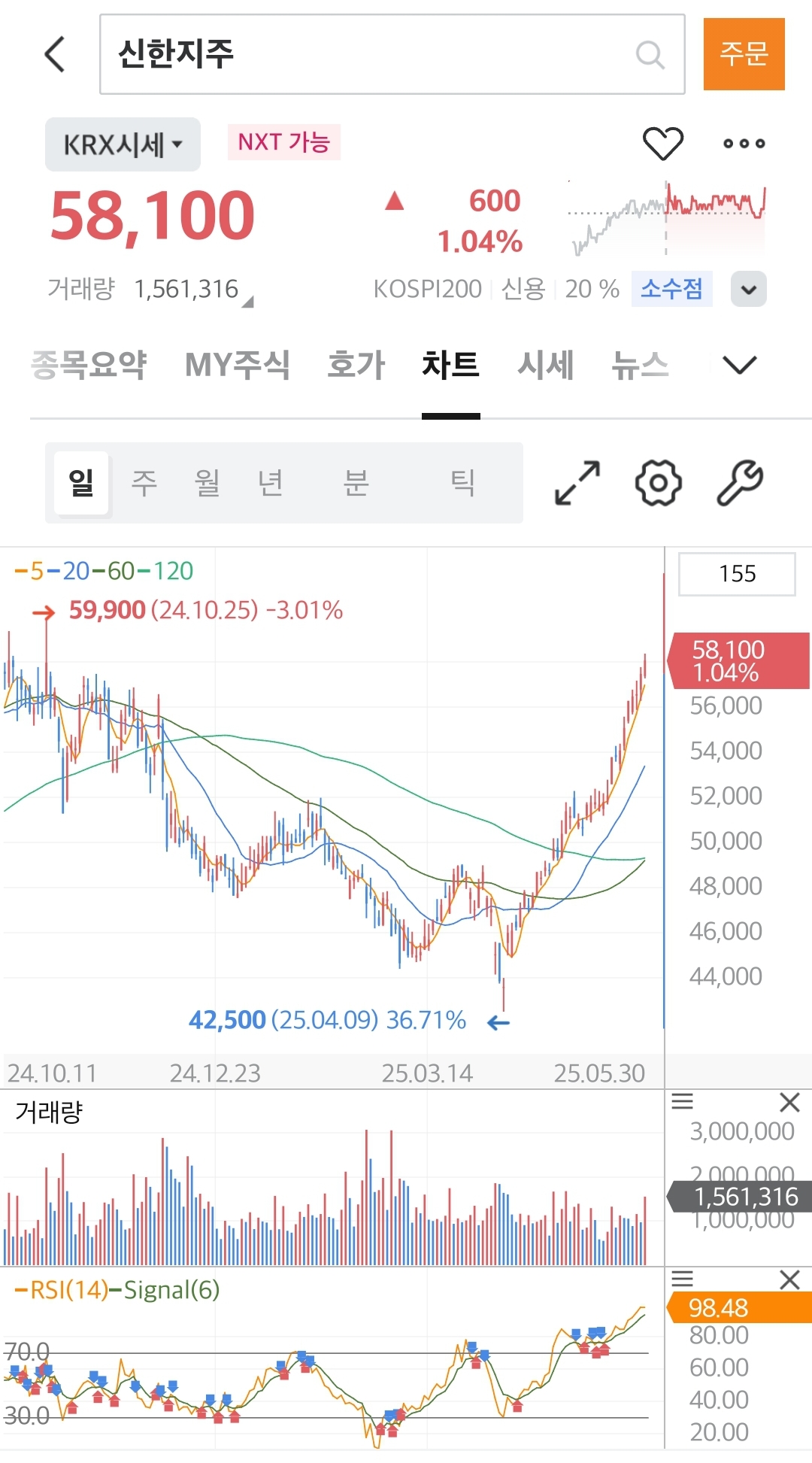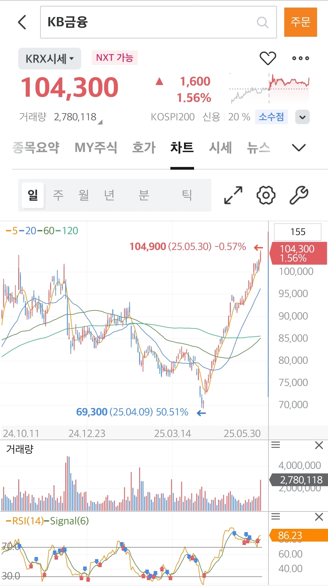 KB금융 주가가 전고점을 돌파하며 새로운 정부정책의 효과로 상승세를 이어갈 것이라는 낙관적인 전망이 우세한 가운데, RSI 지표가 86에 달하는 과매수 구간이므로 투자에 유의할 필요도 있는 상황입니다. 새로 구성될 정부가 코스피 시장에 대해 어떤 정책을 펼칠 것인지 분위기를 지켜보아야 겠습니다,